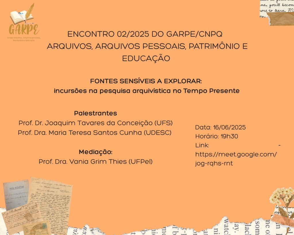 Divulgamos, a pedido da Profa. Dra. Dóris Bittencourt Almeida, o segundo encontro deste ano do Grupo de Pesquisa – GARPE/CNPq – Arquivos, Arquivos Pessoais, Patrimônio e Educação, que contará com a presença dos professores Joaquim Tavares da Conceição (UFS) e Maria Teresa Santos Cunha (UDESC) para uma conversa em torno das sensibilidades na pesquisa arquivística. Serão mediados pela professora Vania Grim Thies (UFPel).