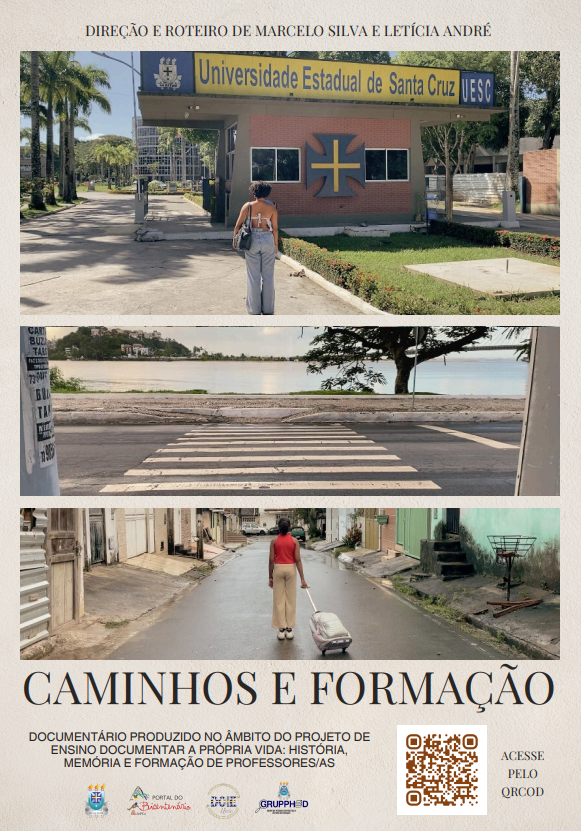 “Caminhos e Formação” é um documentário produzido no âmbito do Projeto de Ensino “Documentar a própria vida: História, Memória e formação de professores/as” (PID/PROGRAD/UESC), em colaboração com os/as alunos/as da licenciatura em Pedagogia da UESC no ano de 2024. Com lançamento em 2025, o documentário é produto das aprendizagens construídas a partir da disciplina de História da Educação e a metodologia da pesquisa documental. Dentre as temáticas presentes, pode-se destacar os aspectos históricos, sociais e políticos atrelados à formação dos sujeitos no processo de escolarização e as instituições educativas de formação, trazendo uma perspectiva que se desdobra desde a educação básica até o ensino superior. O roteiro e direção foi produzido e executado pelo Prof. Dr. Marcelo Gomes da Silva, coordenador do projeto e pela bolsista do projeto, Letícia Alves André. As filmagens tiveram a colaboração do discente Ítalo Lima Santos, licenciando em Educação Física, e a Assessoria de comunicação pela comunicóloga Lara Lufs. O trabalho possui articulação com o DCIE/UESC, a Rede do Portal do Bicentenário e o Grupo de Pesquisa em Política e História da Educação (GRUPPHED/UESC).
