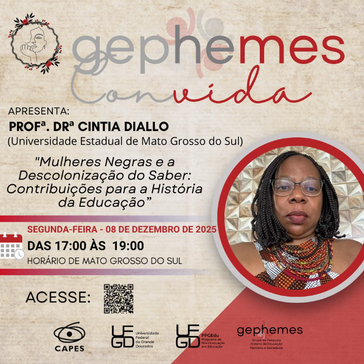 Divulgamos, a pedido da Profa. Dra. Kenia Hilda Moreira, informações sobre o último GEPHEMES CONVIDA 2025, que acontecerá no dia 8/12/2025, às 18h de Brasília, com a professora Cintia Diallo (UEMS), com o tema: “Mulheres negras e a descolonização do saber: contribuições para a História da Educação”.