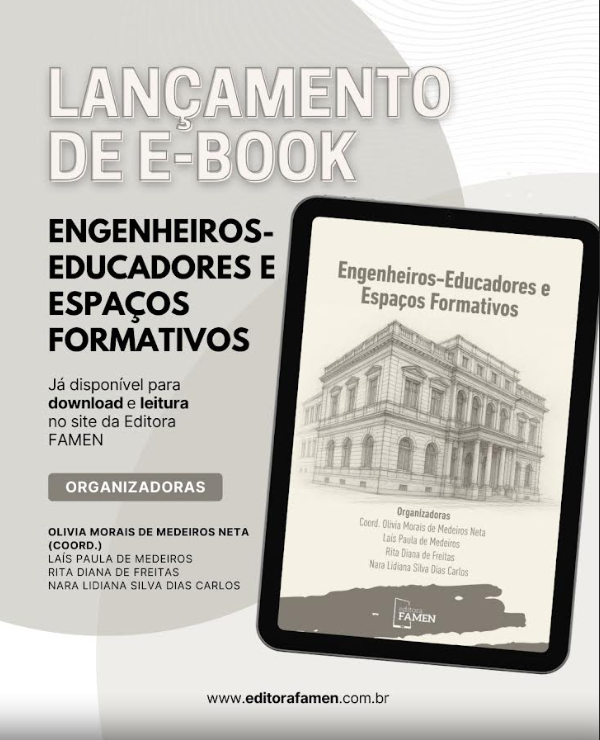 Divulgamos, a pedido da Profa. Dra. Olivia Neta, o e-book “ENGENHEIROS-EDUCADORES E ESPAÇOS FORMATIVOS”, Coordenado por Olivia Morais de Medeiros Neta, e organizado por Laís Paula de Medeiros, Rita Diana de Freitas e Nara Lidiana Silva Dias Carlos, acabou de ser publicado e já está disponível no site da Editora FAMEN.