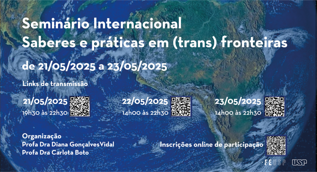 Divulgamos, a pedido da Profa. Dra. Diana Gonçalves Vidal, o Seminário Internacional Saberes e Práticas em (trans) fronteiras, que será realizado presencialmente nesta semana na FEUSP, mas também será transmitido por streaming.