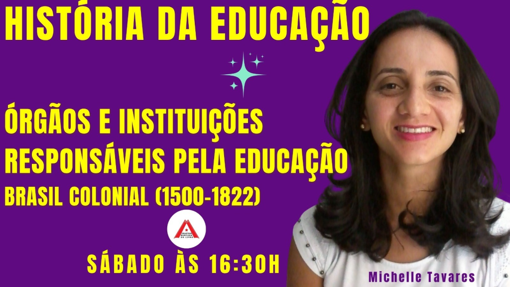A pesquisadora e apresentadora Michelle Tavares conduziu, no dia 07/06, uma live imperdível sobre os órgãos e instituições responsáveis pela educação no Brasil Colonial (1500–1822).