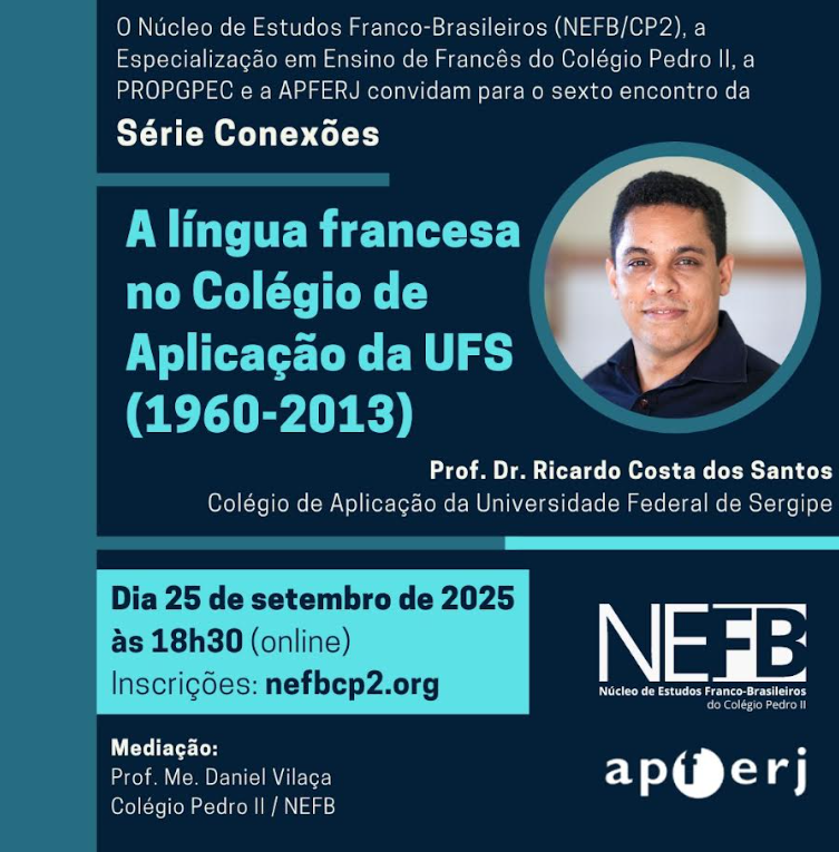 O Núcleo de Estudos Franco-Brasileiros e o curso de Especialização em Ensino de Francês do Colégio Pedro II, com o apoio de sua Pró-Reitoria de Pós-Graduação, Pesquisa, Extensão e Cultura e a parceria da Associação dos Professores de Francês do Estado do Rio de Janeiro, convidam para o 6º encontro da Série Conexões.
