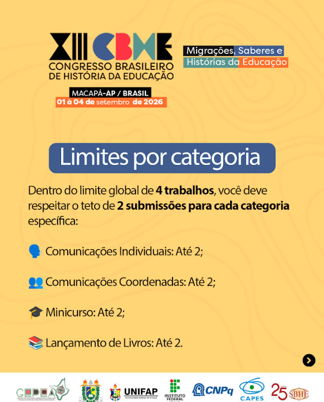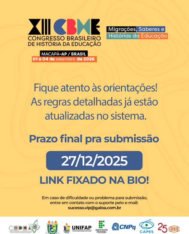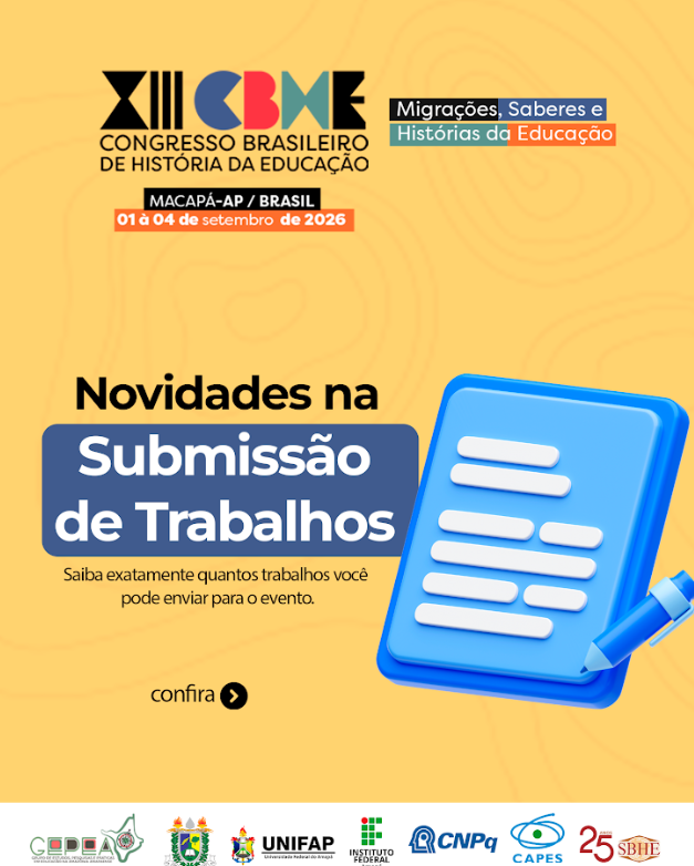 XIII CBHECONGRESSO BRASILEIRO DE HISTÓRIA DA EDUCAÇÃO Macapá-AP / Brasil01 a 04 de Setembro de 2026 Migrações, Saberes e Histórias…