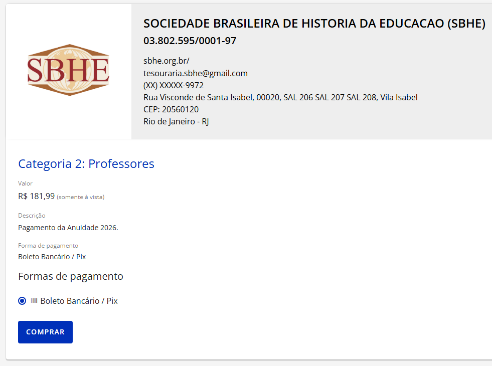 Categoria 1: Estudantes de graduação, pós-graduação e professores da Educação Básica. Para esta categoria, é necessário enviar comprovante de vínculo institucional para o e-mail: tesouraria.sbhe@gmail.com